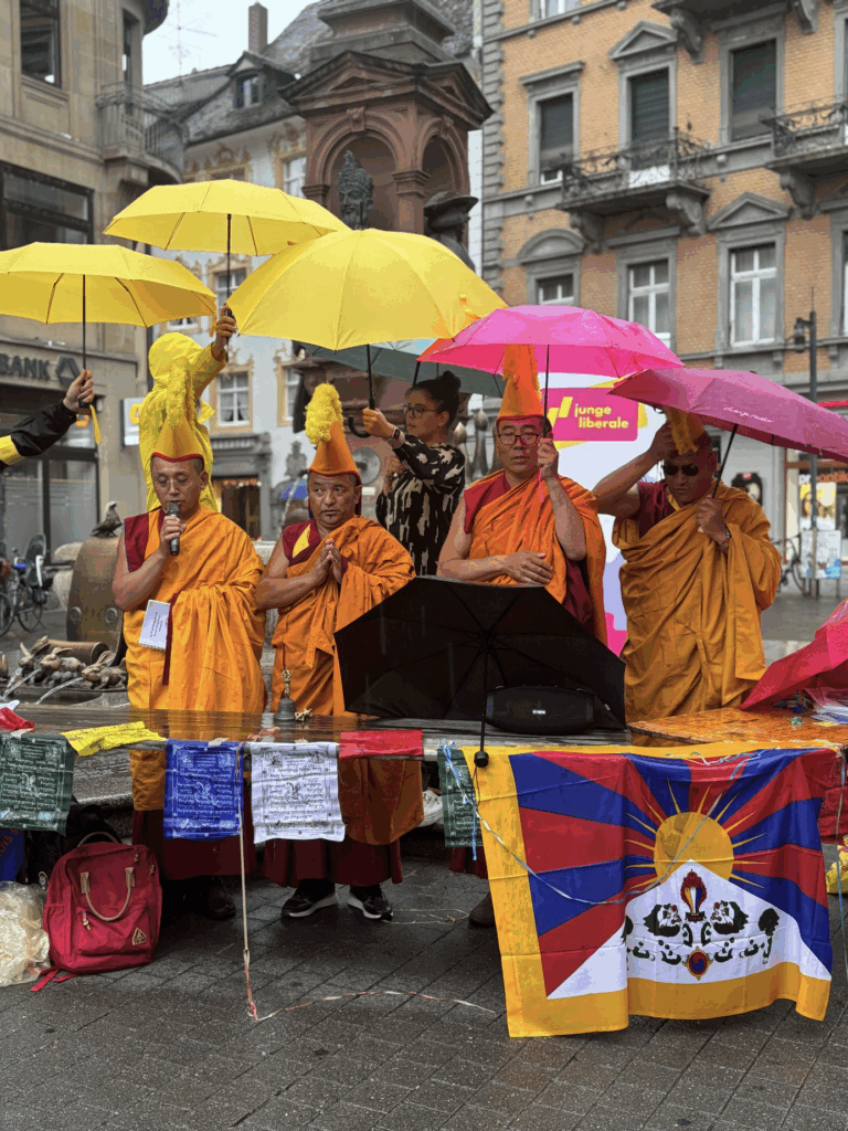 Trotz starker Regenschauer versammelten sich am Montagabend rund 50 Teilnehmerinnen und Teilnehmer auf der Marktstätte in Konstanz zur öffentlichen Kundgebung „Tibet nicht vergessen – Feier zum 90. Geburtstag des Dalai Lama“.